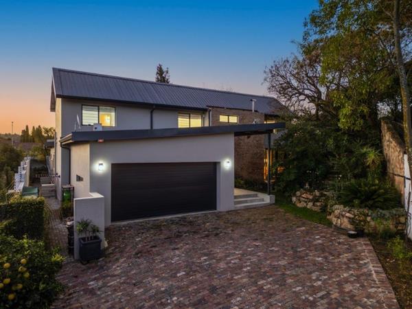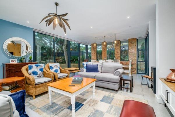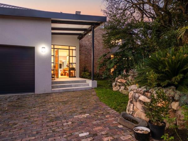 The kitchen flows into an informal dining and entertainment area, featuring a built-in braai, a bespoke beverage prep station complete with a charming original South African Railways prep bowl, space for a bar fridge, and stacking doors that open out to the garden bringing the outside in, effortlessly.
