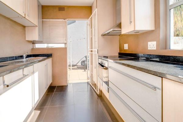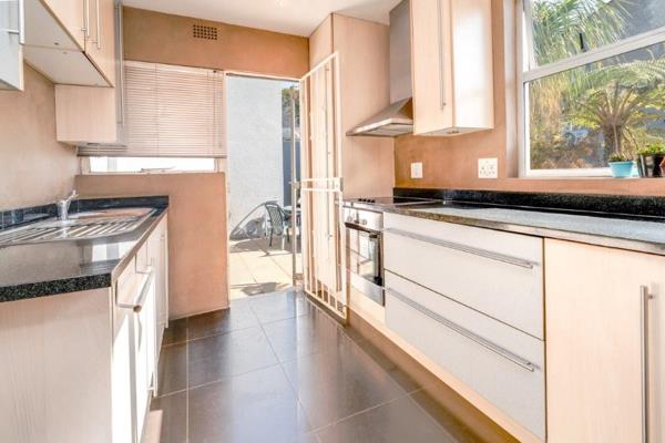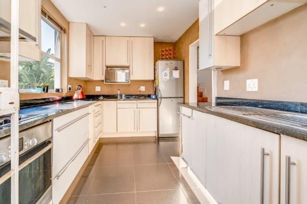 The gourmet granite kitchen is both practical and sociable, offering ample cupboard space, room for all your appliances, and even a second fridge. A breakfast bar or conversation counter connects the upper-level kitchen to the lounge and dining area below, adding architectural flair and function. A separate private courtyard includes a specially built storeroomideal for housing your washing machine and extra storage needs.