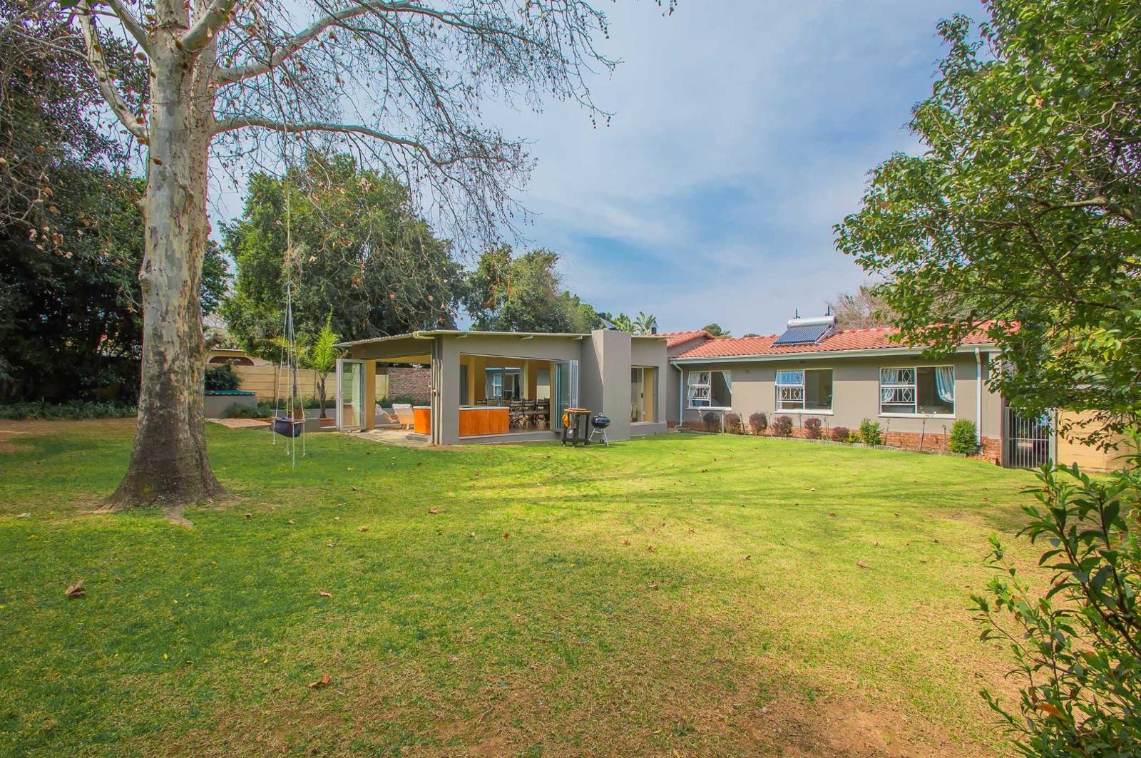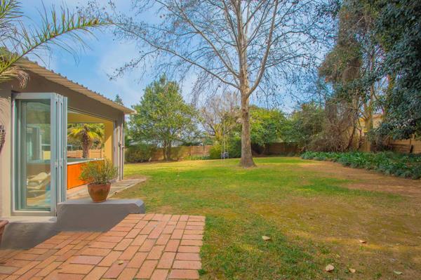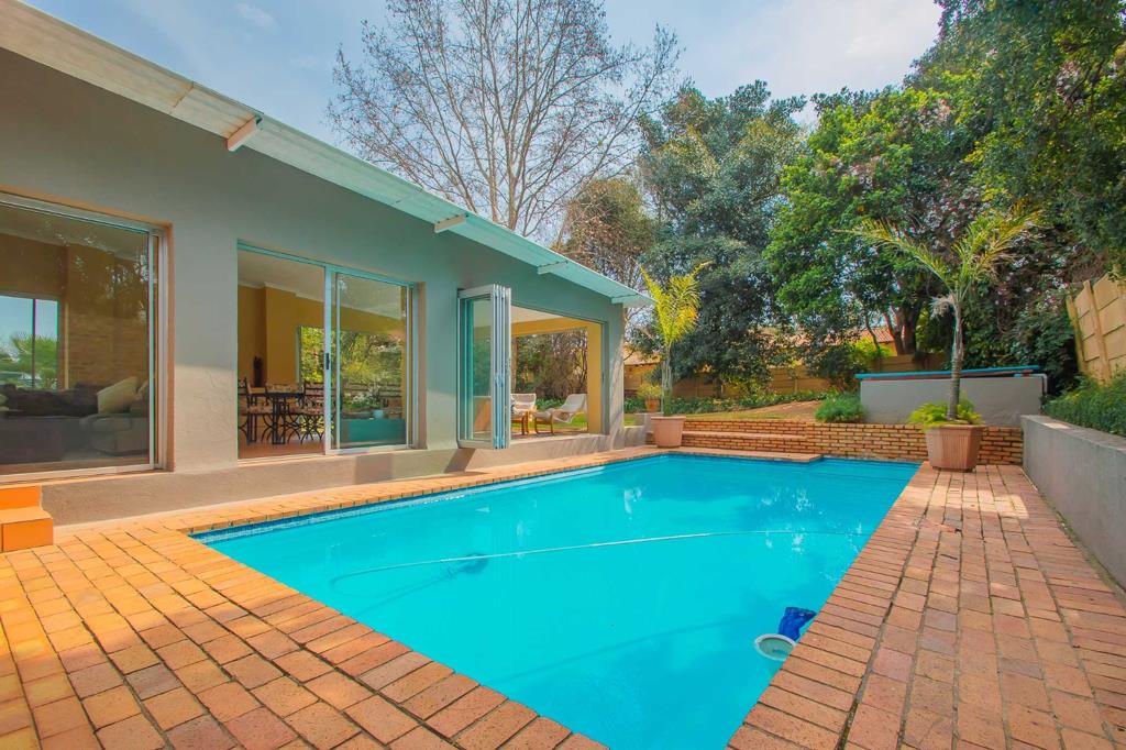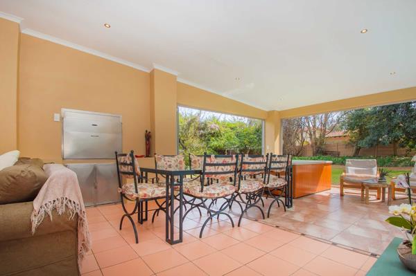 The enclosed entertainment area is expansive, it has sliding doors, stacking doors, a jacuzzi, a built-in braai and overlooks the large lush garden and blue sparkling swimming pool. The swimming pool has solar heating panels.