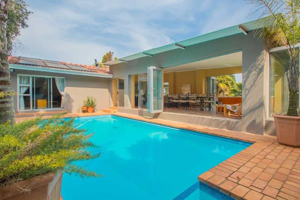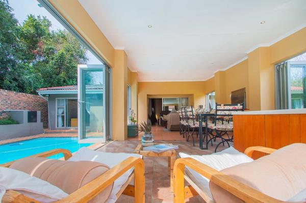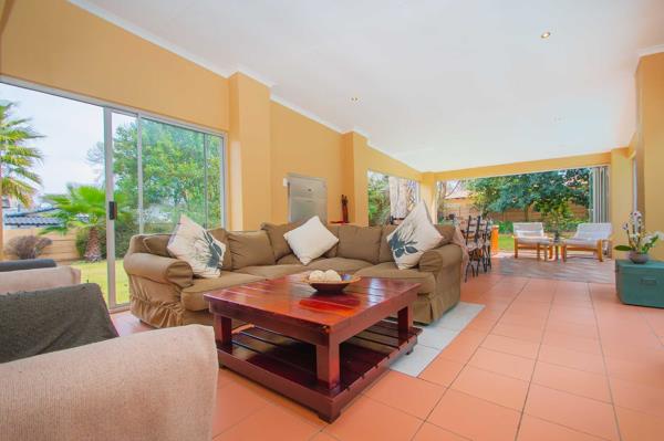Open-plan living areas set the scene - the first lounge has a cozy fireplace and a skylight, the second lounge is complimented by a large bar with downlights and in the centre of the living areas is the dining table. The lining areas flow out to the pool and directly into the enclosed entertainment area. The home offers a solar geyser, with the option to switch to electric, and has a second electric geyser and is fibre ready.