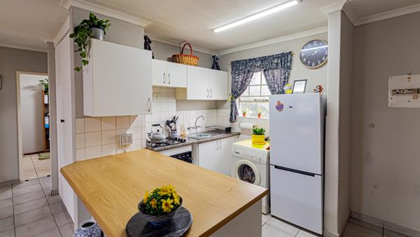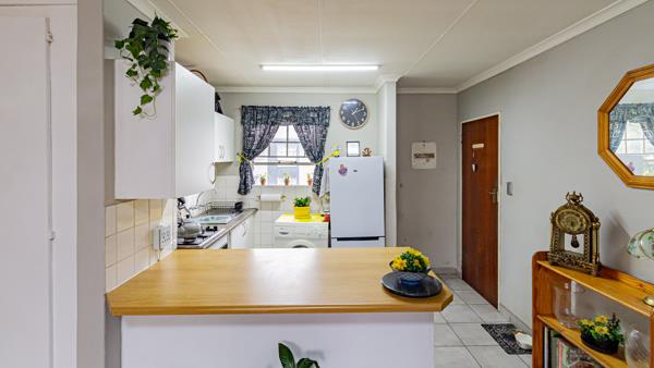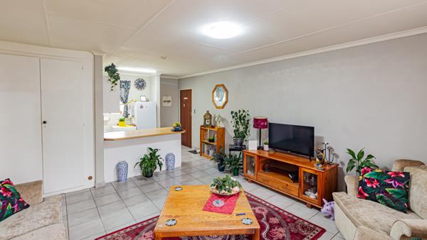 The door opens into the well maintained and loved kitchen. Kitchen is fitted with built in cupboards and a gas hob. There is ample space for other kitchen appliances. The open plan leads to the most spacious living room area that is warm, welcoming and spacious allowing for your lounge furniture and more. The apartment has 2 large bedrooms with built in cupboards. The lovely clean bathroom fitted with a shower completes.