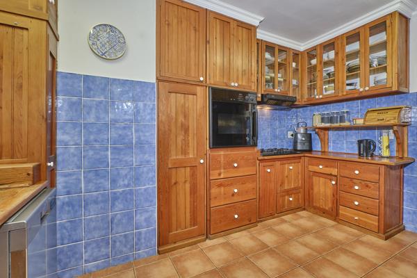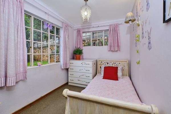 The main bedroom enjoys tranquil views over the pool and features built-in cupboards and air conditioning. This room also houses the solar system setup, which powers the home excluding the geysers, pool, and oven. A well-sized full en-suite bathroom complements the main suite.