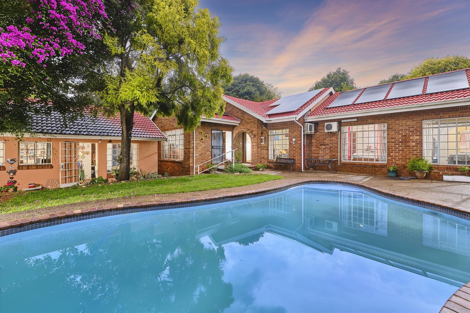 The outdoor space offers a well maintained garden with a natural, flowing layout. At its heart is a stunning solar-heated swimming pool, perfectly complemented by a lapa designed for effortless entertaining and features a built-in braai, bar counter, paved flooring, and built-in seating creating the ideal setting for family and friends.