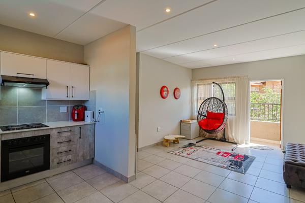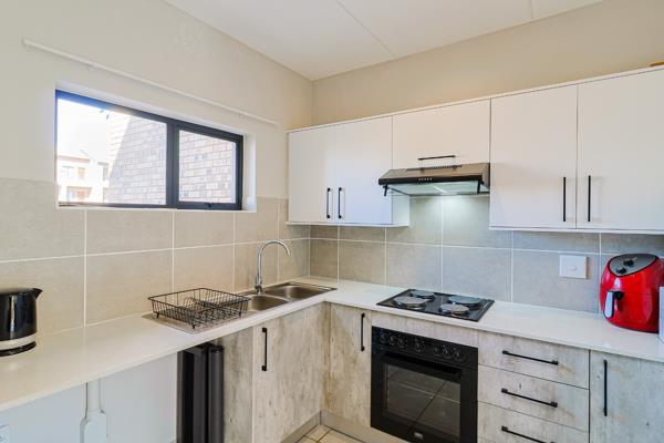 Step inside to a bright, open-plan living area. The lounge is bathed in natural light from a large window and a door leading to your private balcony a great spot for relaxing. Durable tiled flooring and modern recessed ceiling lights create a welcoming atmosphere. The contemporary kitchen boasts sleek white upper cabinets, stylish textured lower cabinets, and light countertops. It''s equipped with a built-in oven, electric hob, extractor fan, double stainless steel sink, and space for a large modern refrigerator.