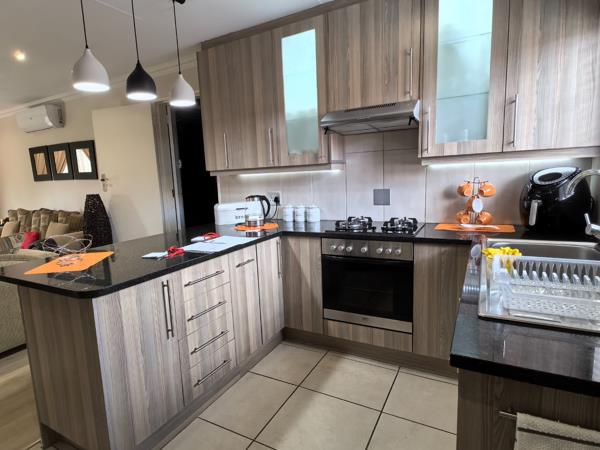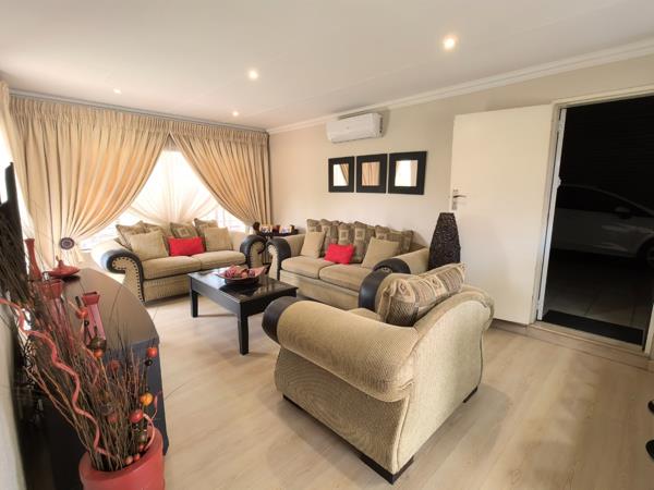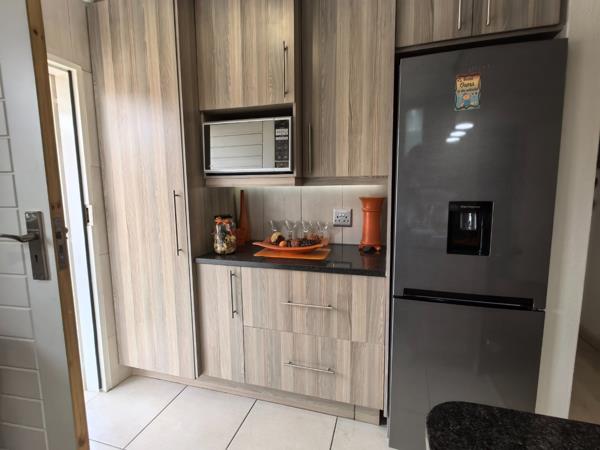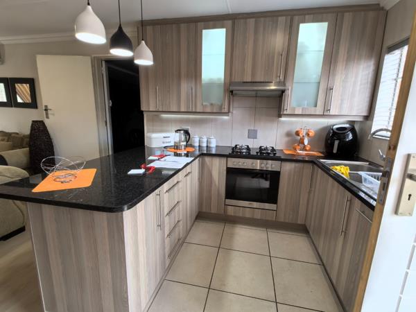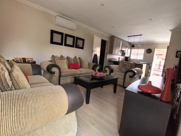This immaculate face-brick townhouse offers modern comfort and convenience with 3 spacious bedrooms, 2 stylish bathrooms, an open-plan kitchen with granite tops and a gas hob, and a lounge with laminated flooring. It includes an automated, fully tiled double garage with direct access and plumbing, a double carport, and pet-friendly front and back gardens. Added features include a 3kVA solar inverter system for energy savings. Ideally located near main routes, schools, and shopping centreswelcome to your new home!