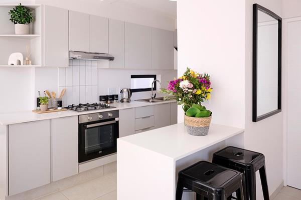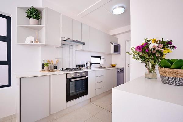 Contemporary Kitchen with premium cabinetry, gas stove, under-counter oven, extractor, pantry, broom & linen cupboards, plus space for 2 appliances