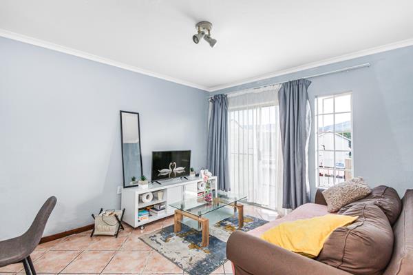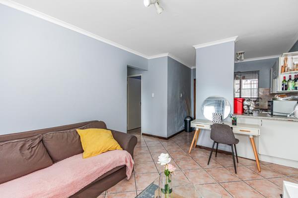 The unit features two tiled bedrooms, one bathroom, and a modern kitchen with ample cupboard space. The open-plan, tiled lounge area opens onto a communal garden, providing a peaceful outdoor space. The property includes a single covered carport with additional guest parking, as well as 24-hour access-controlled security for added peace of mind.