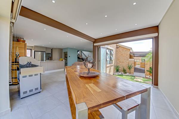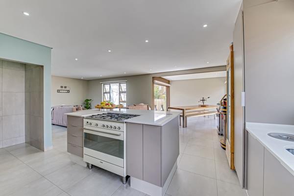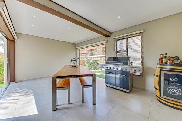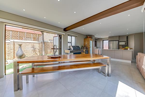 An Open plan, dining, lounge and incorporating the kitchen is an amazing space where bespoke taste levels take precedence. The white Ceaser stone counter tops in the Kitchen complements the contemporary tiles throughout the home. The centre island in the kitchen has a built-in gas stove and forms an open encounter between the avid chef and their guests. The large appliances have been cleverly placed to add to the ambiance of the home.