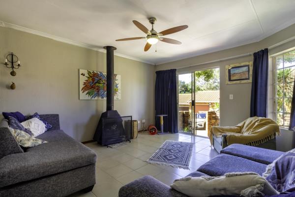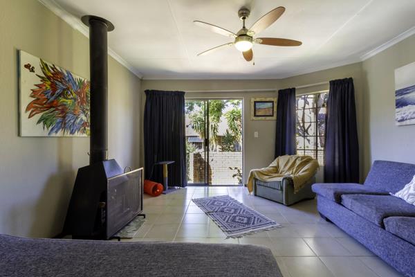 Enter through a sliding door into a sun-filled, tiled lounge featuring a cozy fireplace, perfect for warming up on chilly winter evenings. The space flows seamlessly into a stylish, modern open-plan kitchen equipped with newly fitted cupboards and space for two appliances. The back door from the kitchen opens to the garden and courtyard, offering both convenience and privacy.