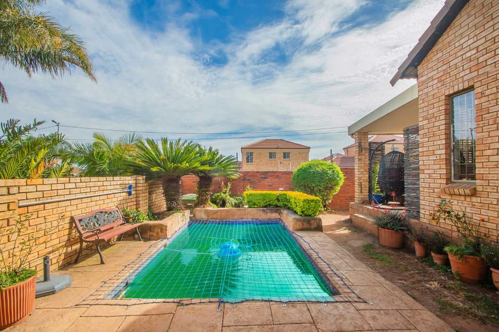 As you enter this stunning Home you are welcomed by the open-plan modern kitchen that has granite tops, space for two water appliances, a fridge and has ample cupboards. This overlooks the dining area and large lounge with double volume ceilings that leads out to the undercover patio. Outside is a lapa with a built-in braai, a blue sparkling pool and lush green garden that is pet friendly and wraps around the Home.