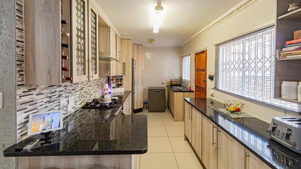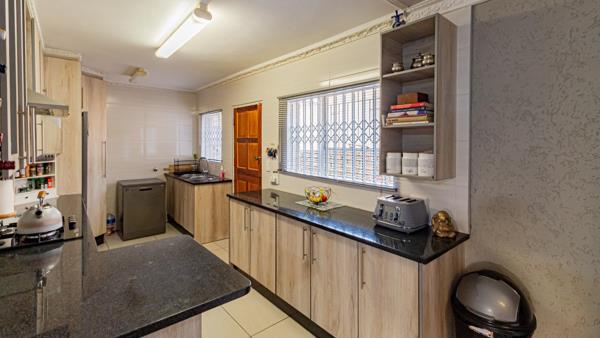 A modern kitchen with granite tops all round makes it a comfortable space, with loads of cupboards and space for your fridge and microwave. The gas hob is perfect for those load shedding evenings and the under counter oven as well as the breakfast nook finishes this kitchen off beautifully.