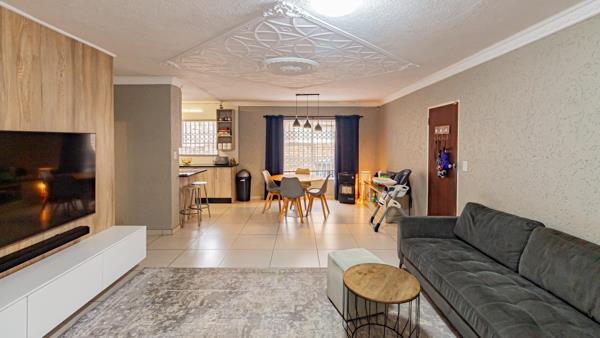 This home welcomes you into an airy, open plan lounge and dining area with a decorative ceiling and stunning tiles. A built-in TV Cabinet adds to the modern feel and creates storage space under the stairs.