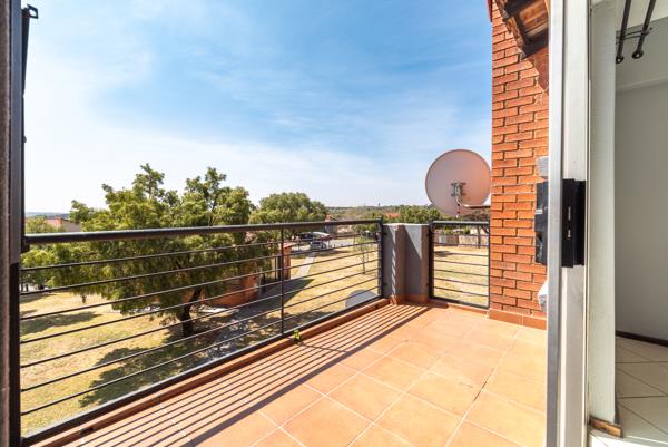 Glass sliding doors open onto a private balcony with a built-in braai and scenic views, while the additional private courtyard provides a practical outdoor area for laundry.
