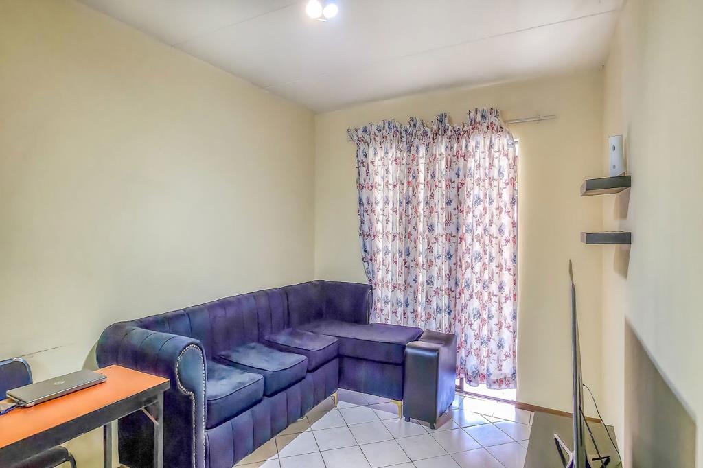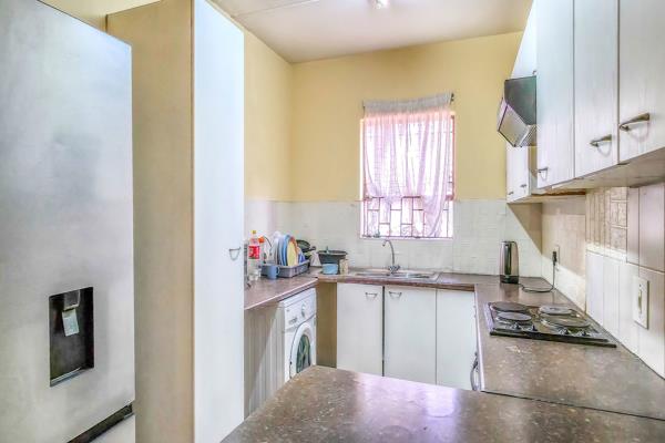 The open-plan living and dining area is well-proportioned, allowing for a comfortable lounge setup and dining space. The adjoining kitchen features cupboard space, room for essential appliances, and a convenient layout for easy meal preparation.