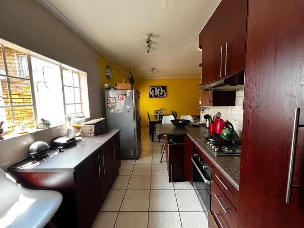 Spacious Kitchen with generous counter space and cabinetry ideal for appliances, open plan dining and living area that flows seamlessly to a covered patio with built-in braai, ideal for entertaining or relaxing weekends.