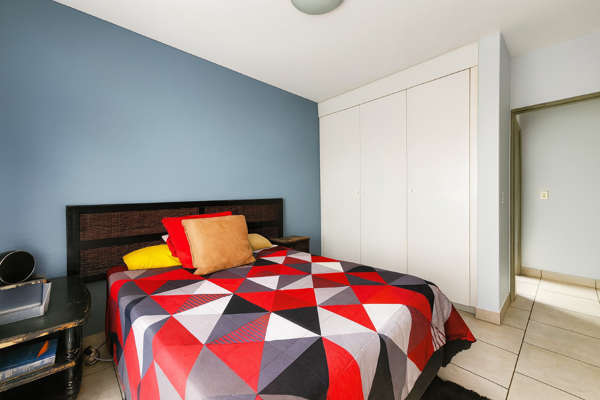 The three well-appointed bedrooms offer tranquil retreats, each featuring practical built-in white wardrobes and continued tiled flooring for a cohesive aesthetic. Alll bedrooms benefit from generous natural light through large windows, some enhanced with calming accent walls. The versatile layout includes a dedicated lounge area and a secure private balcony with a tranquil feel.