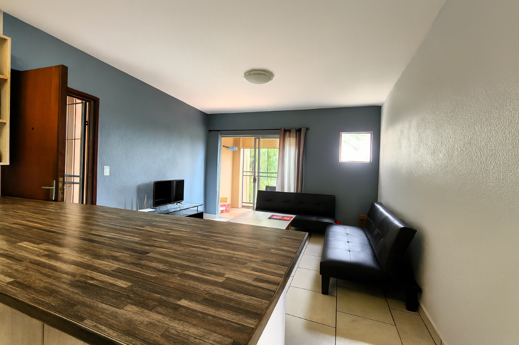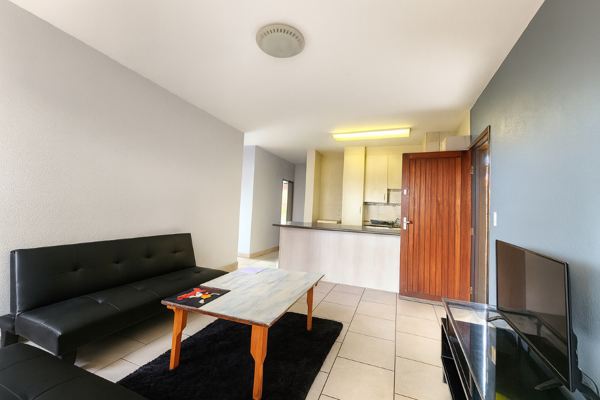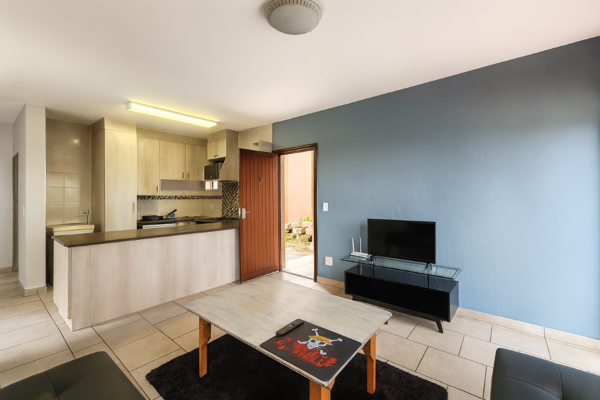 Discover an exquisite opportunity for sophisticated urban living within this meticulously designed 3-bedroom, 1-bathroom apartment, nestled in a secure complex in Wilro Park, Roodepoort. Spanning a comfortable 67 square metres, this residence epitomises modern elegance with its seamless open-plan layout. The contemporary kitchen boasts sleek light wood cabinetry, dark countertops, a stylish mosaic tiled backsplash, and integrated appliances including an oven and hob, alongside a convenient breakfast bar. The living area, adorned with a striking blue accent wall and durable tiled flooring, flows effortlessly, bathed in natural light from a sliding door that opens onto a private balcony, perfect for serene moments.