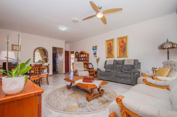 The generous open-plan lounge and dining room area create a warm