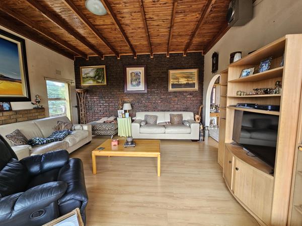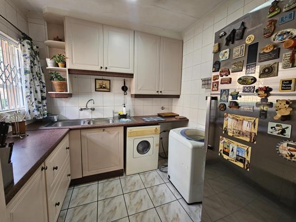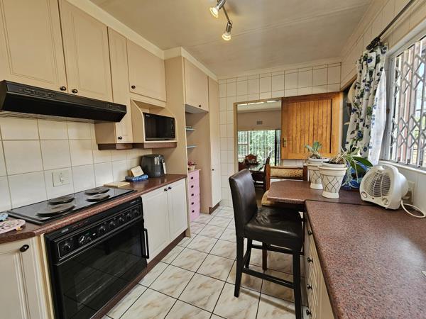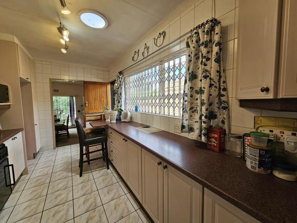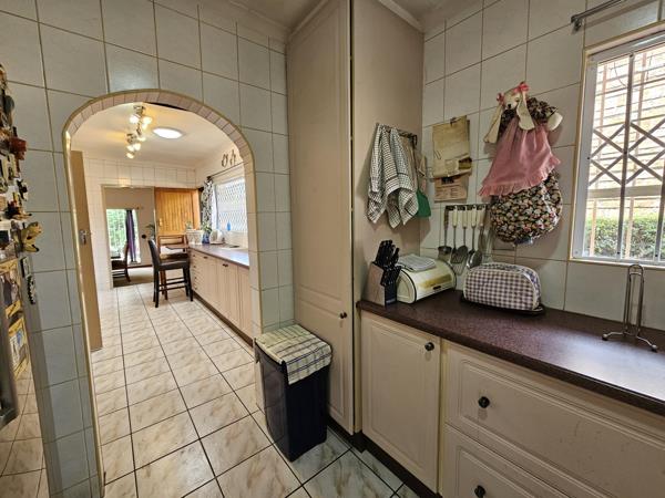 The home features three well-sized bedrooms and two bathrooms, ideal for comfortable family living. The kitchen includes ample cupboard space and a separate scullery, offering practicality and convenience.