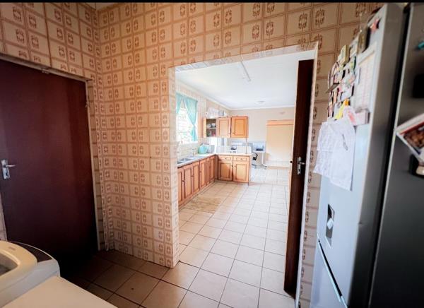 Inside, the home offers a functional layout with one lounge and a dedicated dining room, providing ample space for relaxation and entertaining. The kitchen is equipped with practical tiled flooring, wooden cabinetry, and generous counter space, benefiting from natural light. While the kitchen''s aesthetic is somewhat dated, it remains fully functional and awaits modern enhancements. A separate utility area is also visible, adding to the home''s practicality.