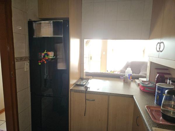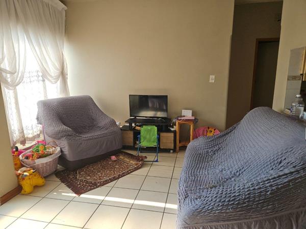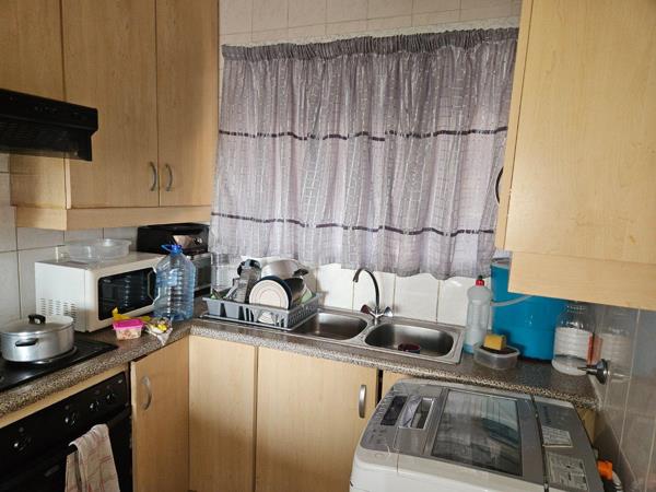 The flat features two bedrooms and a single bathroom, along with a lounge that flows out to a small private balcony perfect for relaxed mornings or afternoon sun. The kitchen is fitted with a convenient pass-through to the lounge, which doubles as a practical breakfast counter or serving hatch.