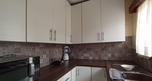 Step inside to discover a functional layout designed for comfortable living. The heart of the home, the kitchen, boasts modern white cabinetry with sleek handles, providing ample storage space. Dark wood-look countertops are complemented by a distinctive patterned backsplash, creating a contemporary aesthetic. Natural light floods the space through windows, highlighting the wood-look laminate flooring. Equipped with modern appliances including a refrigerator and electric stove, and featuring a practical double sink, this kitchen is ready for culinary endeavours, though some wall tiles present a more traditional touch.