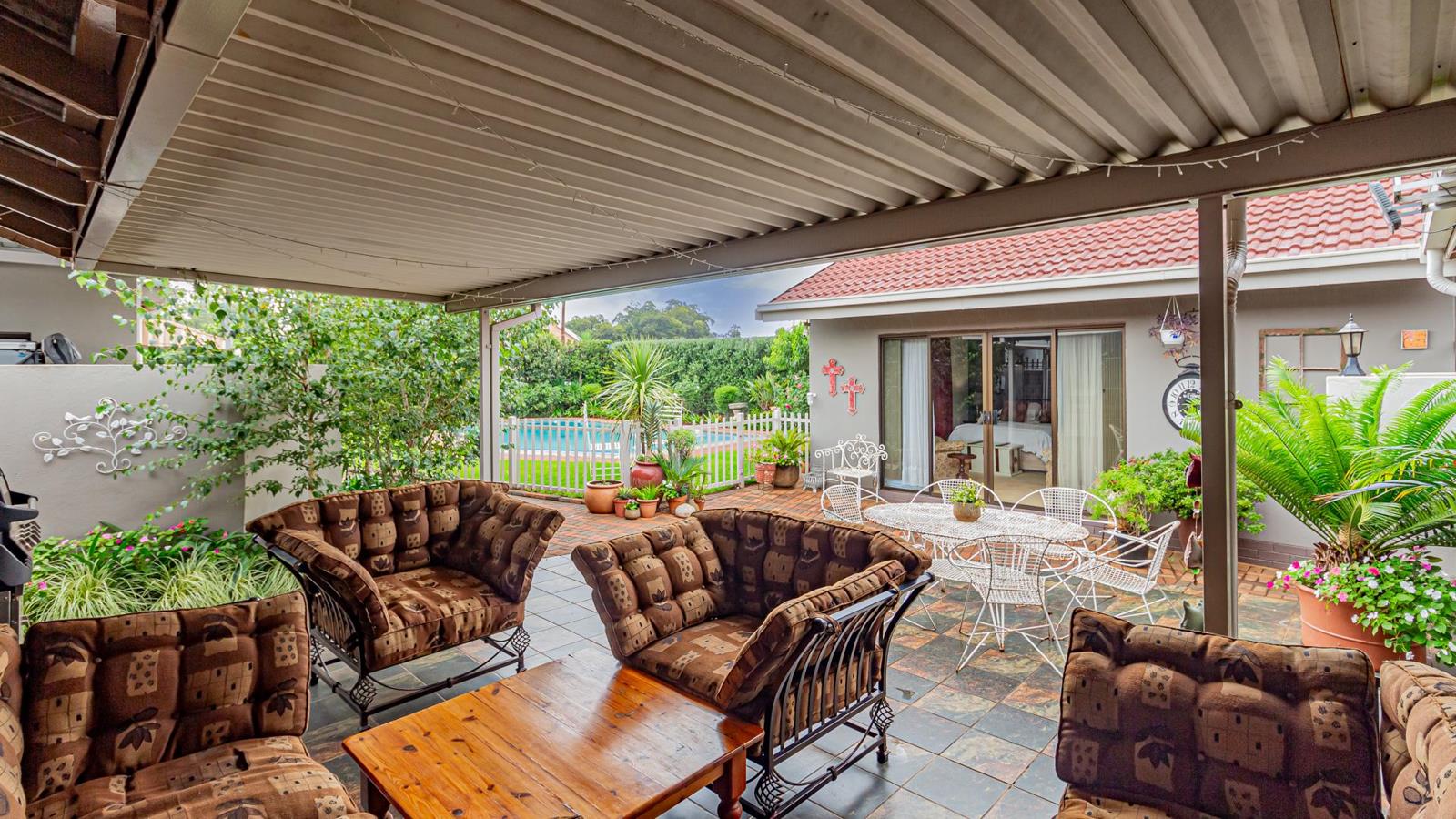 The large, well-design kitchen with 2 stoves, is perfect for meal prep and family time. If you love entertainment - the bar and sparkling swimming pool is perfect for hosting and relaxing. This home offers ample-sized bedrooms, with two boasting en-suite bathrooms for added privacy. Maintain the garden effortlessly with a sprinkler system and newly installed watertanks wit presure pump. The convenience of an outdoor laundry room, what a win. Enjoy the dedicated nursery space to nurture your love for plants. Equipped with solar panels for energy efficiency, the home also offers air conditioning in both living rooms and the main bedroom for year-round comfort. A pressure pump and newly installed water tanks, ensures consistent water pressure throughout the property and when water sypple gets interrupted, adding to the convenience of this well-equipped home. The top-tier security is offering peace of mind for you and your family.