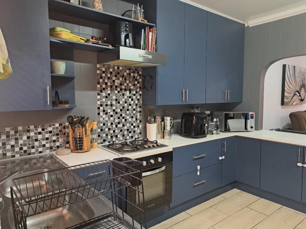 The contemporary kitchen is equipped with stylish navy blue cabinetry, contrasting white countertops, and an integrated gas hob and oven. A double sink and a distinctive mosaic tile backsplash add to its appeal, while ample storage and space for a washing machine ensure practicality. Security features, including burglar bars on windows and a security gate on the exterior door, provide peace of mind.