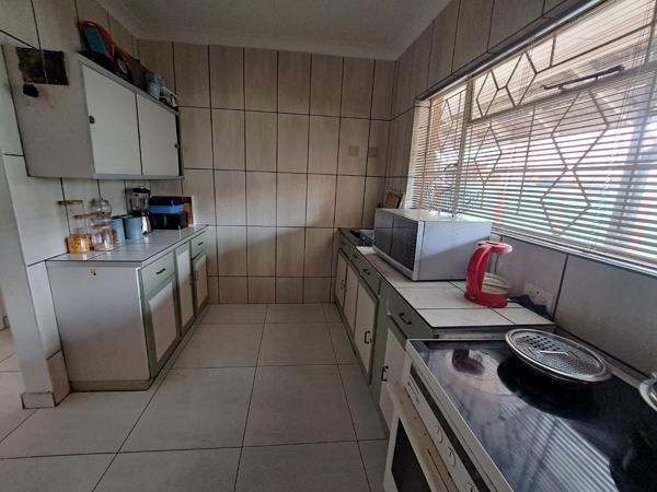 The functional kitchen boasts tiled floors and walls, providing ample natural light through a large window fitted with security bars for added peace of mind. While offering decent counter space and both upper and lower cabinetry, this kitchen presents a wonderful opportunity for a new owner to infuse their personal style and modernise the finishes to their taste. It''s a space ready for culinary creativity.