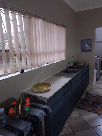 Inside, the home features three comfortable bedrooms and two bathrooms, with one being an en-suite for added privacy. The living spaces include a welcoming lounge with a distinctive wooden panel ceiling and a rustic stone accent wall, creating a warm focal point. Large windows throughout ensure ample natural light and pleasant views of the surrounding greenery. The combined kitchen and dining area is practical, offering abundant blue steel cabinets, tiled flooring, and under-cabinet lighting. A dedicated study provides a quiet space for work or hobbies, and a separate laundry room with a double basin adds to the home''s functionality.