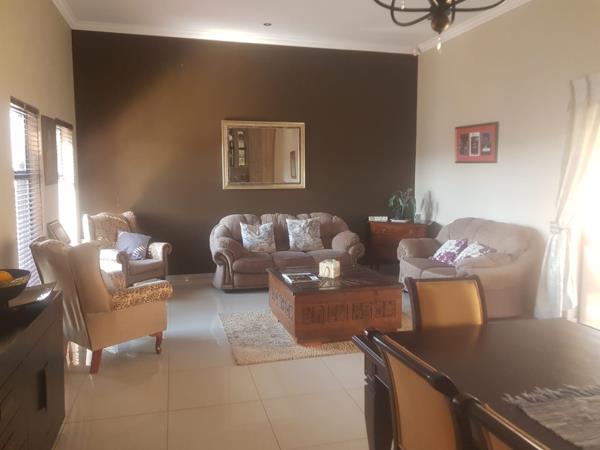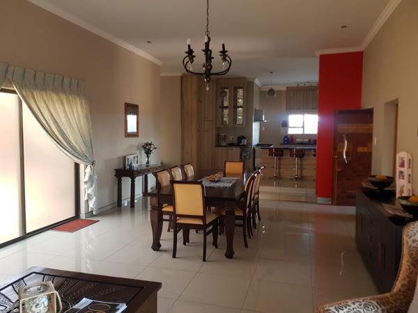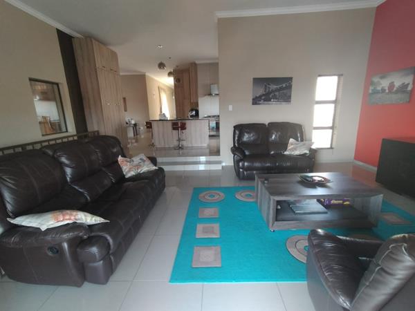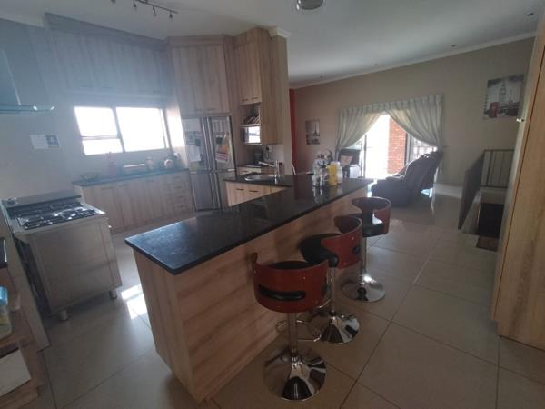 The house presents a sleek and modern facade, with face brick exterior and neat yard. An inviting double garage with automated doors provides secure parking for your vehicles. The property is encircled by electric fencing and equipped with an alarm system, ensuring your safety and peace of mind.