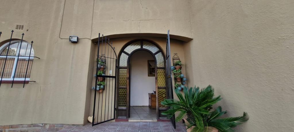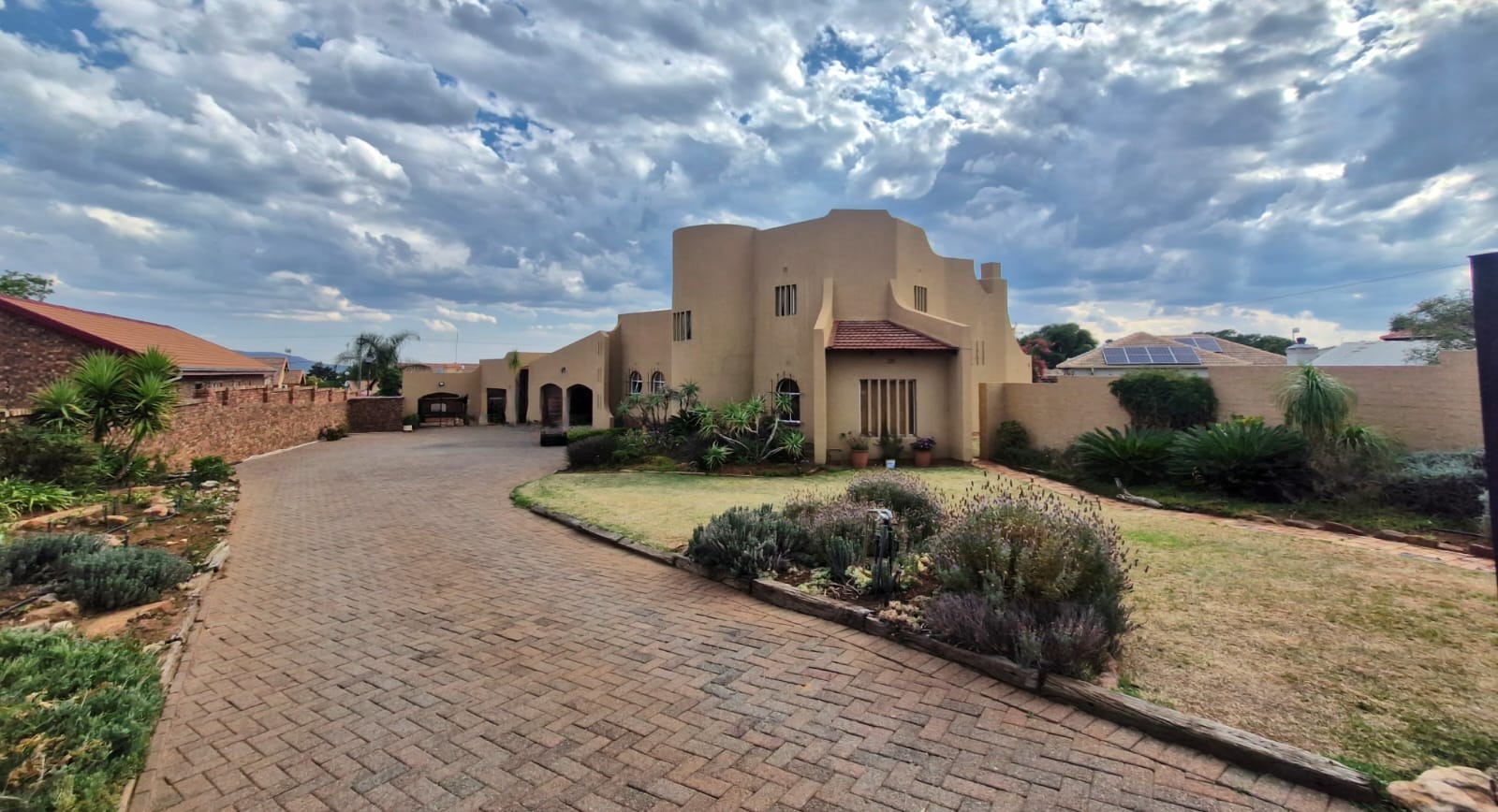 Discover this distinctive property in Fochville, offering a unique architectural style and an expansive 1781 sqm erf. The residence immediately impresses with its fortress-like exterior, large paved driveway, and mature landscaping, providing a strong sense of arrival and security. Enhanced by a secure brick perimeter wall, ornamental arched gate, electric fencing, and burglar bars, peace of mind is paramount.