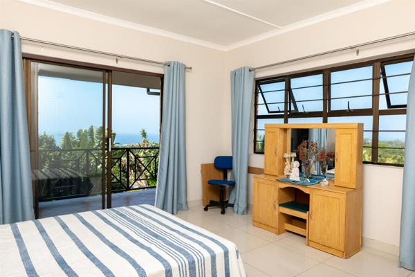 Four bedrooms are positioned on the upper level with three bedrooms each having direct access to a spacious outdoor elevated wrap-around covered balcony that offers panoramic sea and suburban views. The master en-suite has a full bathroom and walk-in wardrobe, and the other three bedrooms share one full bathroom.