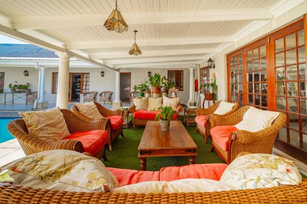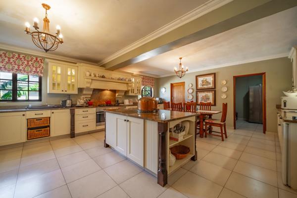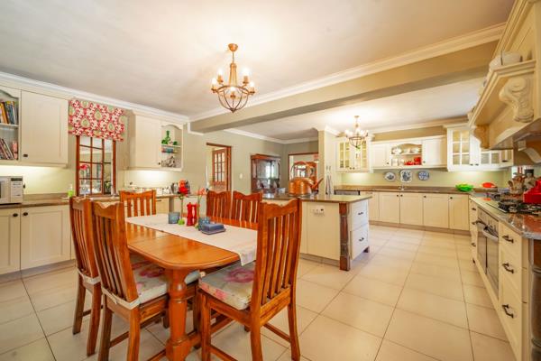 Beautiful Canadian pine flooring set the tone for the living area''s. Formal lounge & family lounge bring loads of character with stainless glass and Oregon pine doors. Visitors reception room. Very spacious dining room with a 14 seater setting. Large farmhouse kitchen with granite tops, gas double oven, walk in pantry & sep. laundry. Pub with oak finishes. 5 spacious bedrooms and 3 mes bathrooms. Beautiful manicured garden with a splash pool. Double auto garaging & visitors parking. Additional features include: bay windows, air conditioning, beautiful traditional fireplace, outside domestic bathroom, Craft room storeroom which can be easily converted into an additional bedroom or flatlet possibilities. 200sm of wrap around covered veranda''s. Club house with Communal pool. 24 Hour security.