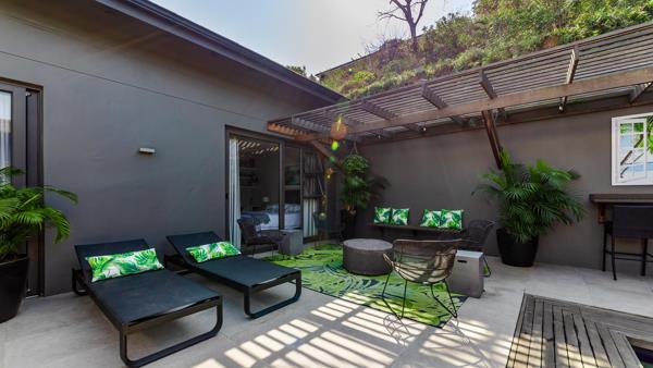 The garden/pool area is secluded and is stylishly designed for living the good life. The covered patio with built-in braai boasts 180 deg sea views.