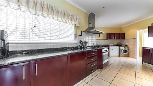 The kitchen is spacious and well laid out, offering granite countertops, a breakfast bar, gas hob, and plumbing for two appliances. High ceilings throughout the living areas add to the sense of space and easy flow.