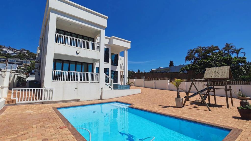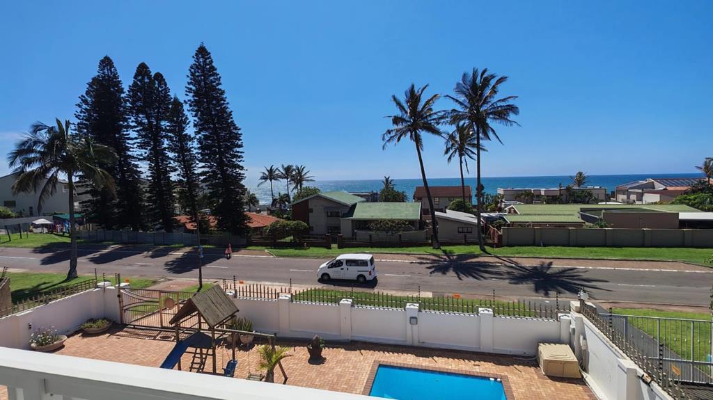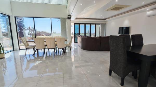Only meters from the beach, this spacious double-storey home offers exceptional sea views, generous living areas and outstanding income-generating potential. The downstairs level welcomes you into a large open-plan living and dining area with porcelain tiles throughout, a fully fitted kitchen and tinted windows framing beautiful ocean views. Both living areas open onto a patio overlooking the pool, garden and childrens play area. This level offers three bedrooms, two en-suite one with a jacuzzi bath, plus an additional separate bathroom.