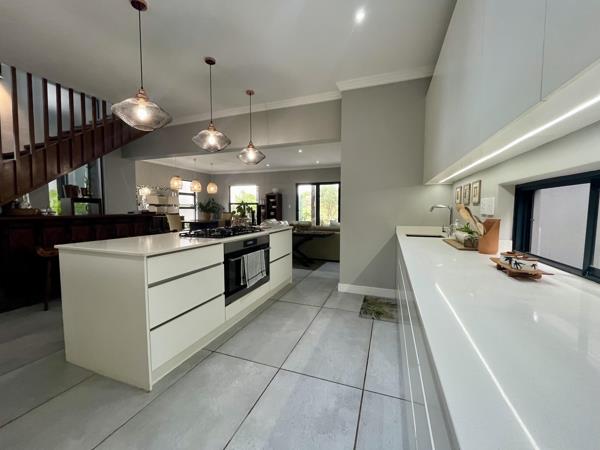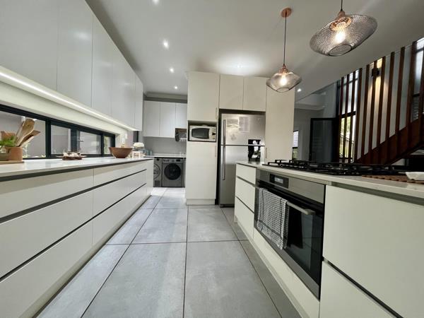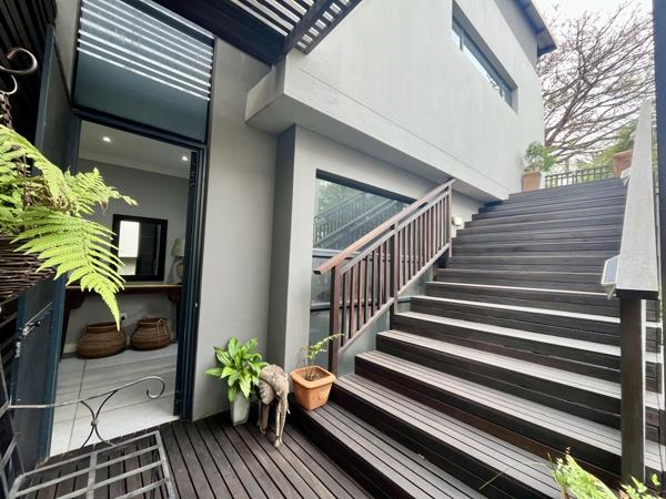 Nestled in the sought-after Dunkirk Estate, this beautiful four-bedroom sectional title home offers the perfect blend of modern living, privacy, and natural surroundings. The property is designed to be tucked away from neighbors, ensuring peace and seclusion. A double garage provides direct access into the home from upstairs, offering both convenience and security. From the side of the house, elegant wooden stairs lead you down to the welcoming front door, setting the tone for the charm and warmth that awaits inside.