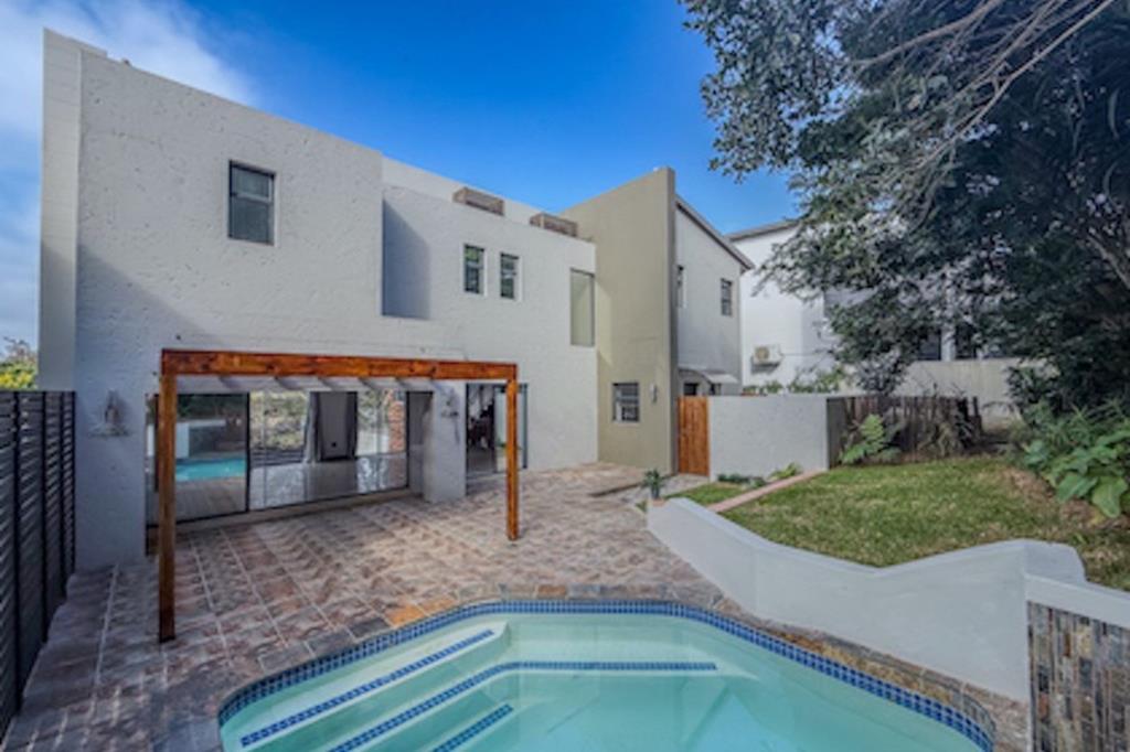 The open-plan lounge and dining area lead effortlessly to a covered entertainment patio with a splash pool, ideal for family gatherings or relaxed afternoons. The spacious kitchen features an electric stove, built-in convection microwave, extractor fan, and separate scullery, with doors opening to a private courtyard and a second, large balcony for outdoor dining.