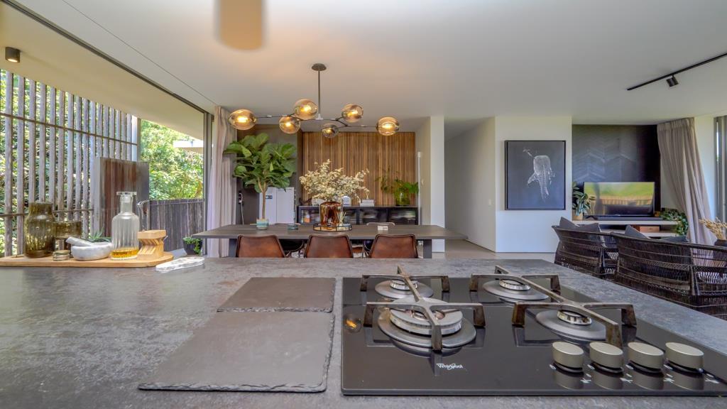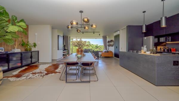 This modern 3-bedroom, 3-bathroom apartment offers a sophisticated open-plan living experience within the esteemed Dunkirk Estate in Ballito. Spanning 140 sqm, the residence seamlessly integrates a stylish kitchen, dining area, and lounge, all bathed in abundant natural light. The contemporary kitchen boasts sleek dark cabinetry, a large island with an integrated gas hob, and ample storage, perfect for both everyday living and entertaining. Light tiled floors flow throughout, enhancing the spacious feel, complemented by modern lighting fixtures and integrated air conditioning for year-round comfort.