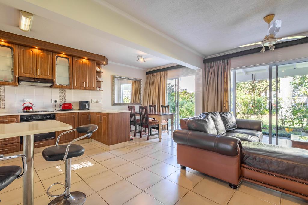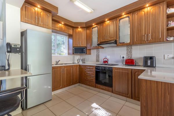 Three-bedroom home in Manor Estate. This property features an open plan living and dining on entrance. The kitchen is fitted with Ceasar stone tops and centre island with barstool seating. Leading off the kitchen is the living space which opens through sliding doors onto a covered patio overlooking the pet friendly garden.