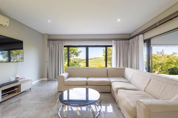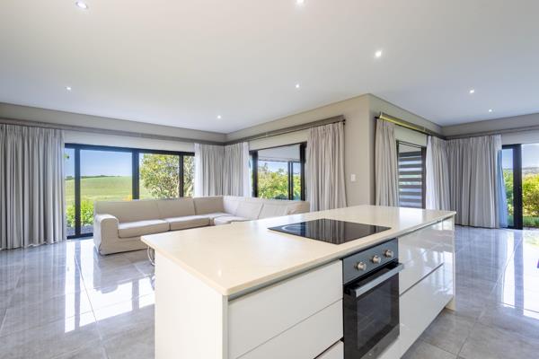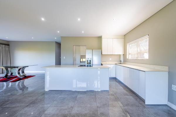 Double level family home in Palm Lakes Estate. The lower level of this home comprises of an open plan kitchen, dining and living room opening to an enclosed patio with glass stacking doors leading out to a deck area overlooking the garden. The kitchen features a centre island with separate scullery.