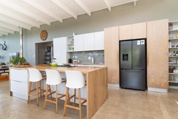 On entry the striking customised oak and white kitchen is an attractive focal point that extends seamlessly into the adjoining dining room and living areas. The central island functions as a practical serving counter or a social hub, whilst the practical scullery area is positioned out of sight.