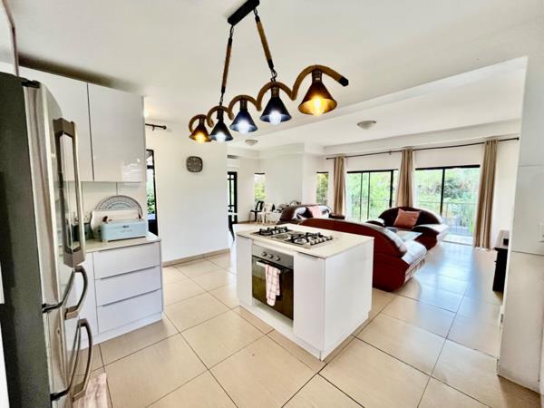 3 bedroom family home with solar system . Step into this charming home with a double garage offering direct access. Ascend the stairs to an inviting living room and open-plan kitchen, leading to a small patio with views. A second patio with a built-in braai overlooks the wrap-around garden, perfect for family and pets. The master bedroom features an en-suite, while two other bedrooms share a full bathroom. Equipped with solar panels, this home blends modern living with sustainability.