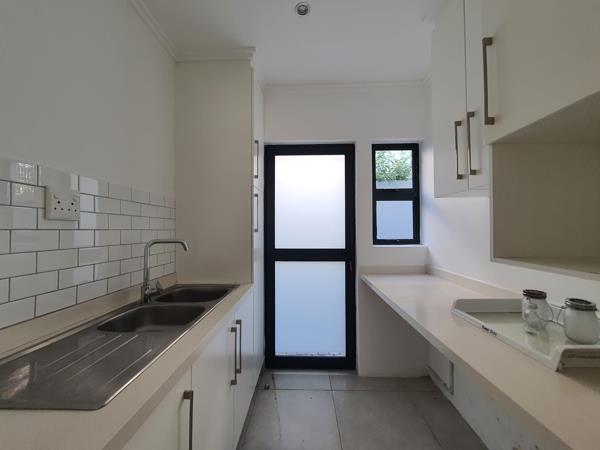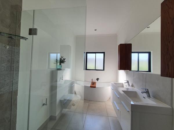 This home boasts a modern kitchen with a separate scullery. Open plan dining room and lounge leading onto a stunning covered patio. A level garden that is fenced off with a well-established garden giving tranquility and privacy. The garden is fenced off and is pet-friendly.