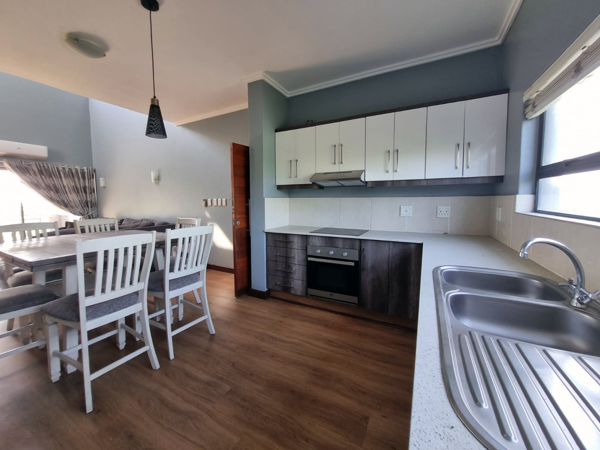 This bright and contemporary open-plan living area features a stunning modern kitchen, dining room, and lounge, all seamlessly flowing onto a private balcony that overlooks a park-like garden, with buck and wildlife right on your doorstep, enhancing your tranquil living experience.