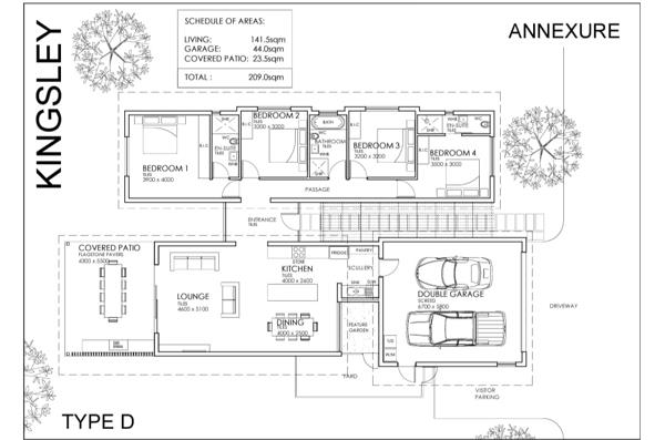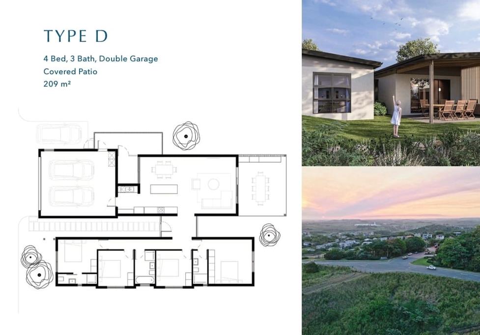 The Type D option has 4 bedrooms and 3 bathrooms, with the main en-suite. The kitchen and living areas are open plan, leading to the patio and private garden.