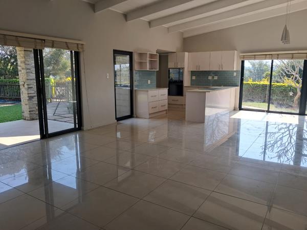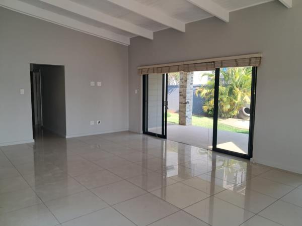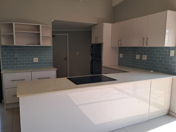 The home features three spacious bedrooms and two stylish bathrooms, with a seamless open-plan layout connecting the lounge, dining area, and contemporary kitchen. The kitchen boasts sleek finishes, ample cupboard space, and a separate scullery for added practicality.