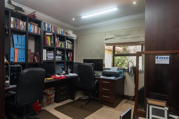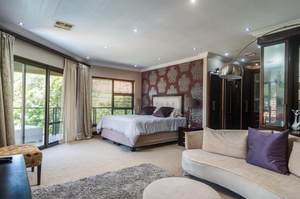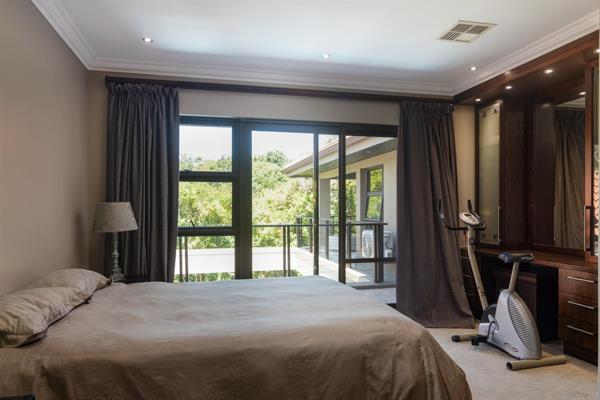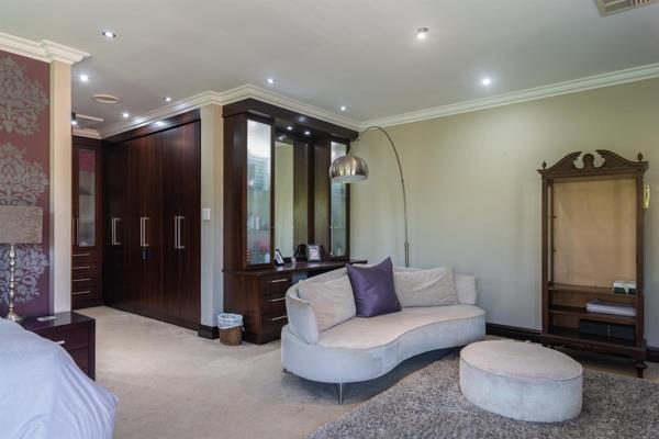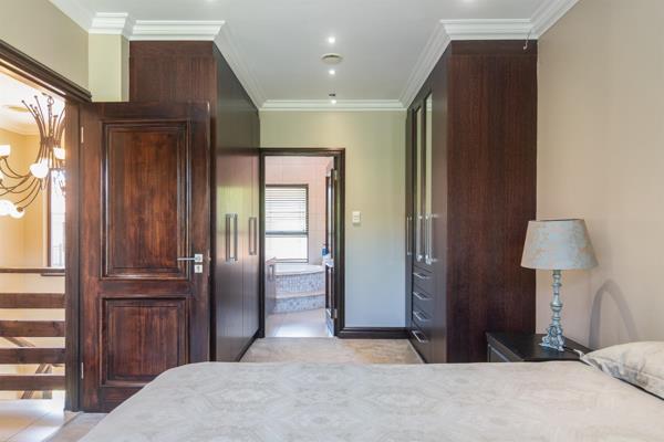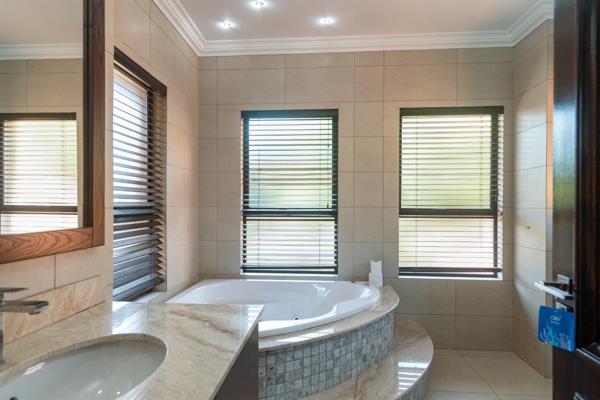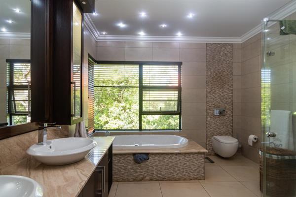 Downstairs offers two spacious en-suite bedrooms with air conditioning, a guest cloakroom, and a double-volume open-plan living area featuring a designer kitchen, dining area, and lounge that flow effortlessly onto the covered entertainment patio with built-in gas braai. A separate TV room, scullery, and pantry add practicality and comfort.