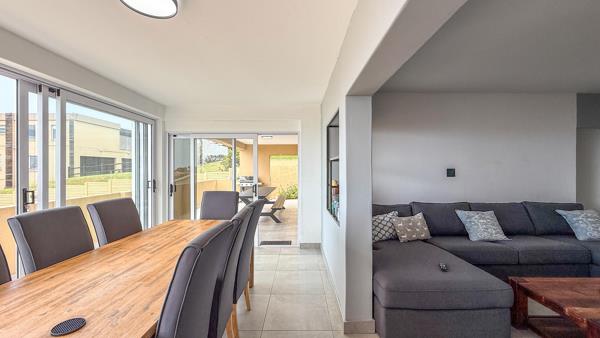 The spacious, light-filled living area opens onto an enclosed patio, ideal for enjoying morning coffee or evening sunsets while taking in the stunning ocean scenery. The modern kitchen flows seamlessly into the open-plan dining and lounge area, creating an inviting space for entertaining or unwinding.